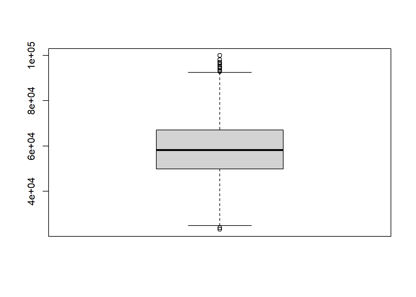 #Filtera bara þær eignir sem taka gildið 2016 á kaupár breytunni. df <-subset(df, kaupar =="2016")#filtera eignir yfir 100 milljónir df <-subset(df, kaupverd <100000)# Síðast fjarlægði ég einnig frávillinga í verði #Kaupverð - frávillingar#Fjarlægi eignir sem kosta yfir 100 milljónir til að fækka frávillingum# df2 = subset(df2, kaupverd< 100000)#Lagfæri mælikvarða núvirði og kaupverðs fyrir túlkun#Geri kaupverð og núvirði svo að túlkun sé auðveldari# df2$nuvirdi <- (df2$nuvirdi *1000)#df2$kaupverd <- (df2$kaupverd *1000)#Staðfesting#Tryggi að allt líti enn eðlilega út#summary(df2)boxplot(df$kaupverd)