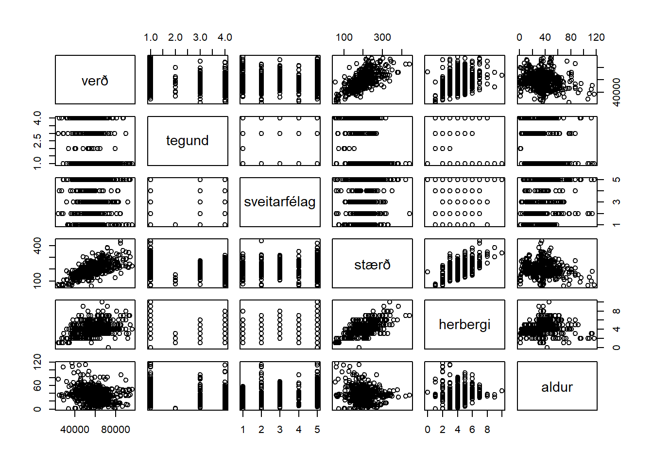 Ef ég vil ekki allar breyturnar get ég valið hverjar birtist með því að skilgreina röðun þeirra með: plot(~breyta1 + breyta2 + breyta3 + breyta4, data=df).